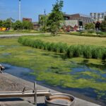 Na een klein uurtje schuilen, werd het toen toch wat droger. Aan de kanten van de Oude Aa, hadden wat grondverschuivingen plaats gevonden en er waren veel plaatsen waar het jonge ingezaaide gras was verdwenen. Nu een jaar later, is het zelfde park aangegroeid tot een heel mooie bloementuin, waar je heel fijn kunt verblijven . Je kunt er in de schaduw, op plaatsen genieten, van al het moois wat er om je heen groeit. Om met dit hete weer in de Oude Aa verkoeling te zoeken is wel af te raden op dit moment, met al dat groene spul dat er op het water ligt. Het is jammer dat dit niet wordt verwijderd, want het nodigt ook nog uit om er lege blikjes en flesjes op te gooien, wat natuurlijk niet de bedoeling is.