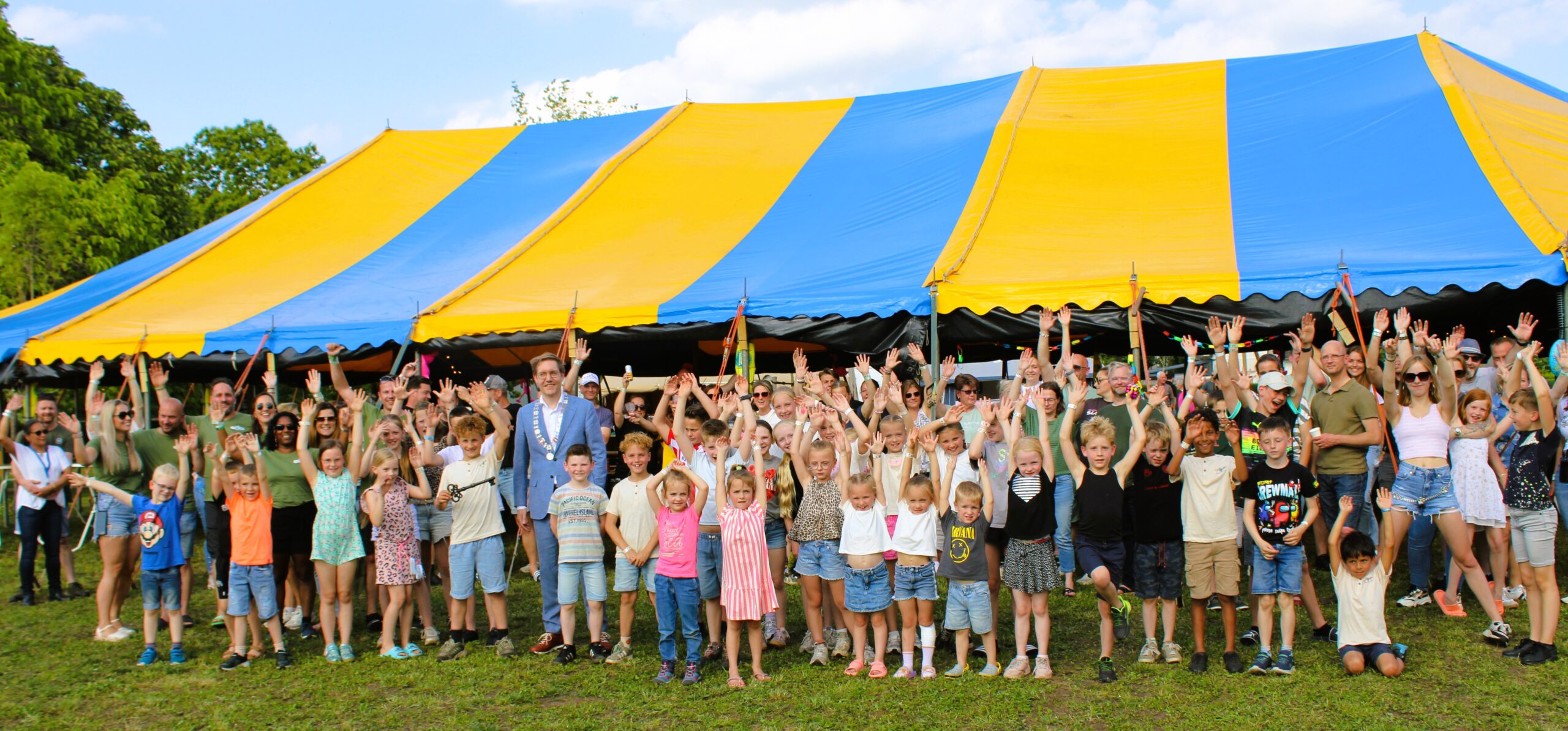 Bonte: “Na een lange voorbereiding staat ie er, Buurtcamping Brouwhuis. Complimenten zijn niet alleen voor de organisatie, maar ook voor de vele vrijwilligers die zich afgelopen dagen bezig hielden met inrichten. Dat is nou het mooie aan zo’n buurtcamping, de samenwerking die ontstaat. Dat er veel belangstelling was, zie je terug in een volle bezetting. De 40 plaatsen voor een tent waren ook snel uitverkocht.” Vervolgens richt Bonte zich op de kinderen die al klaarstaan: “Voor jullie heb ik hier de sleutel van de camping.” Die sleutel wordt vol enthousiasme in ontvangst genomen: “Cool dat wij de sleutel krijgen.” Maar de kinderen vragen zich wel meteen af waar die grote sleutel dan op past. De vijfjarige Saar gaat voor het eerst kamperen, vertelt ze trots aan Bonte.