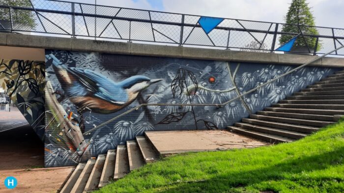 Deze week werd de tekst ,die was gemaakt door de stadsdichter van Eindhoven , Merel Morre aangebracht op de muurschildering. Hij is in blokken op de muur aangebracht en hierna volgt hij als een zin. De vierde Mural, achter de HEMA, is nu helemaal klaar. Hierna staat de muur tekst helemaal op rij en je moet er zelf de komma’s inzetten.