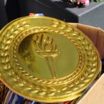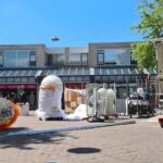 Het was maandag, de 7e juni even een chaos in winkelcentrum Brouwhuis en veel mensen keken een beetje vreemd naar die grote vrachtwagen die op het pleintje stond. Er waren drie mensen keihard aan het werk om alles uit te laden en neer te zetten. Dozen en containers stonden verspreid over het hele plein. Maar de inhoud lokte wel veel kijkers. Het was oranje wat de klok sloeg. Grote medailles, fietswielen, vlaggen, sjaals en natuurlijk een enorme lading slingers.