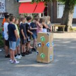 Dus vanmorgen, de 17e juni was het al een bijzondere ochtend op de school. Enkele mensen van de pers en fotografen stonden geduldig samen met de leerlingen van groep 8 te wachten op wethouder Gaby van den Waardenburg, zij zou de prijs overhandigen.