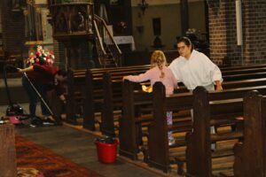 Suzanne gaat verder; “Met zijn drieën – ik, Thijs en Gerard – begonnen we met de eerste klussen. De klusdag moest voor de winter gebeuren. Want met de advent begint het kerkelijk jaar, een goed moment om een grote schoonmaak te houden. Op die eerste klusdag hadden we toen al 40 personen uit de parochie die wilden meewerken.”