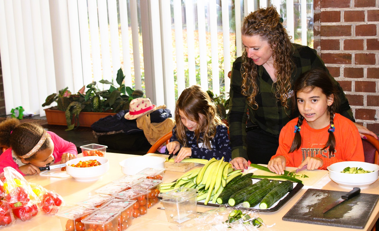 - Sara (bijna 8), Julia (9) en Maria (bijna 11) samen met vrijwilliger Patty