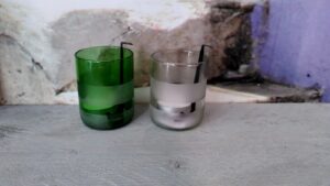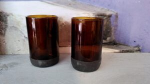 Waxinelichtje houders, drinkglazen en vazen gemaakt van oude flessen. Handbewerkt dus allemaal anders. Zo lijken de vazen allemaal gelijk, maar kijk je aan de binnenkant dan zie je dat er verschillende kleuren flessen zijn gebruikt. En ook bij de drinkglazen kun je onderling kleine verschillen zien.
