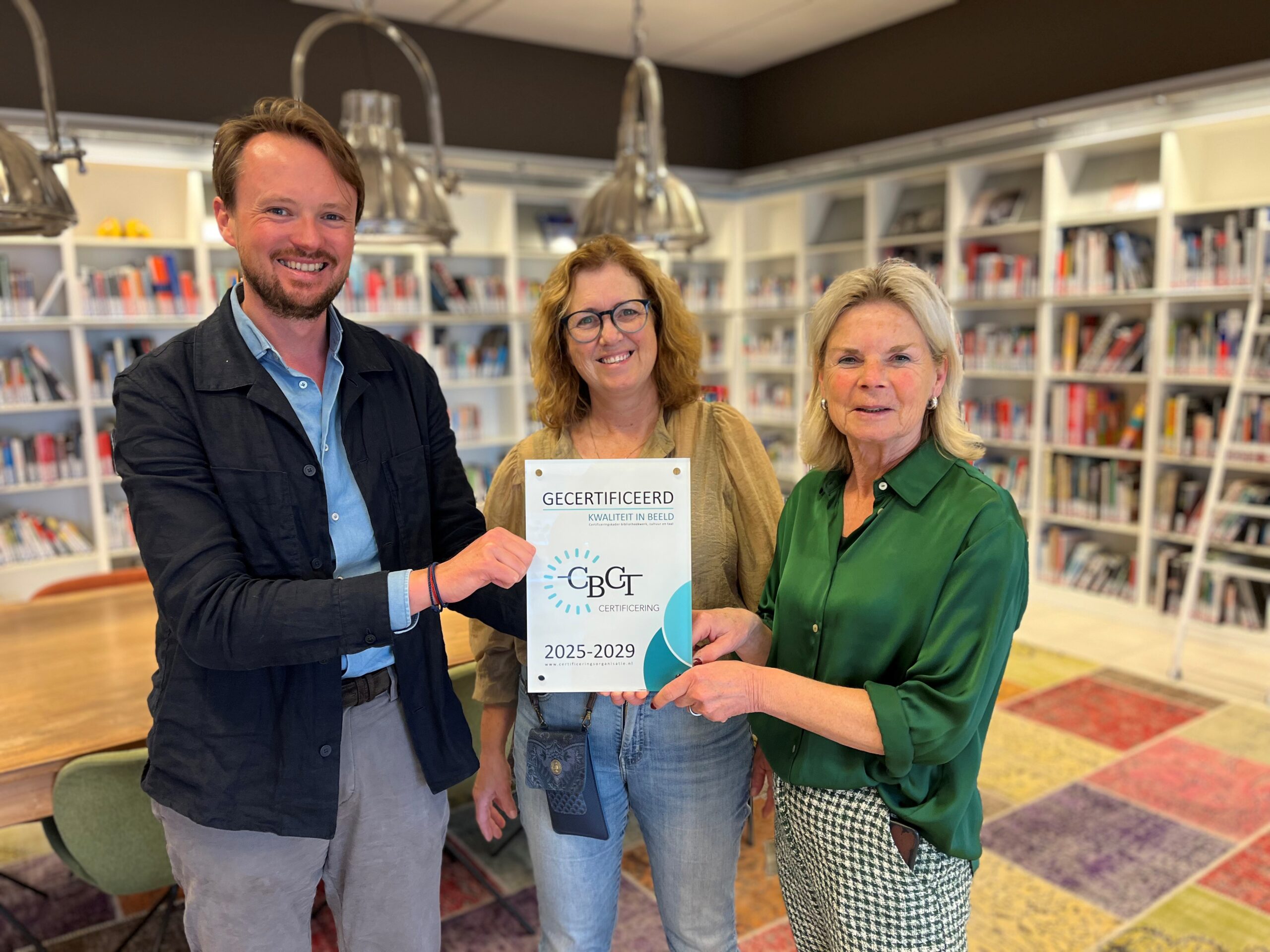 - Robin Verleisdonk, bibliotheekcoördinator Wilma Swinkels en klantadviseur Monique Jansen te met het certificeringsbordje in Bibliotheek Helmond.