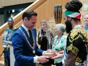 “Als werkgroep hebben we speciaal voor deze Dag van Erkenning een beeld laten maken. Mevrouw Dreischor-Scheepers, voor velen bekend als tante Cilia, overhandigde dit cadeau aan onze burgemeester. Op het beeld staat een Afrikaans symbool, de betekenis hiervan is verzoening. Wij als groep willen met open blik en open hart op weg naar vooruitgang en herstel. Met dit symbolisch teken van verzoening aanvaarden wij de gedane excuses.”